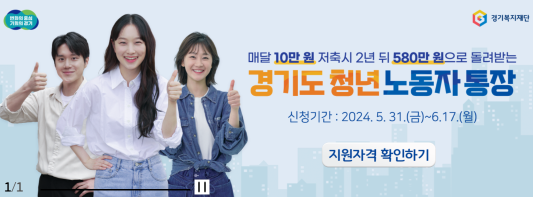 경기도 거주 기준중위소득 120%이하 가구의 청년이 매달 10만원을 저축하면 2년 후 경기도 예산으로 580만원이 적립되는 통장입니다.