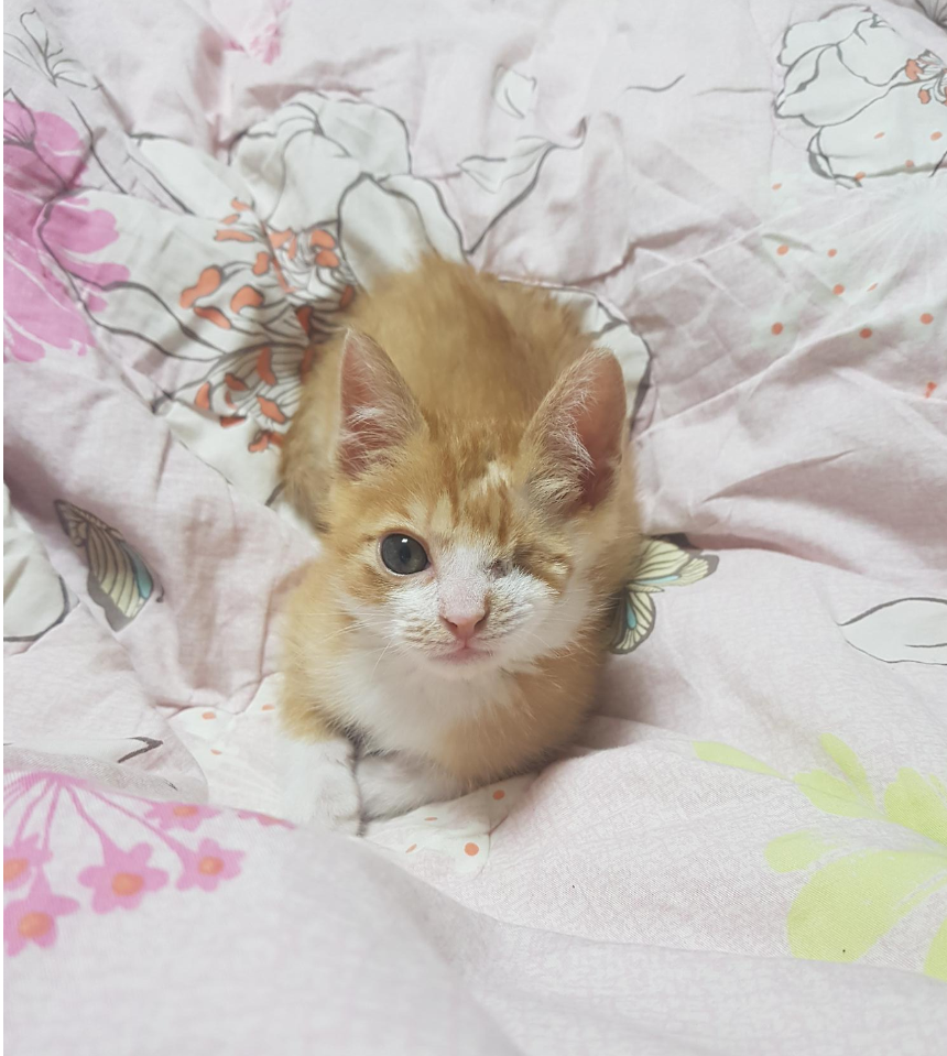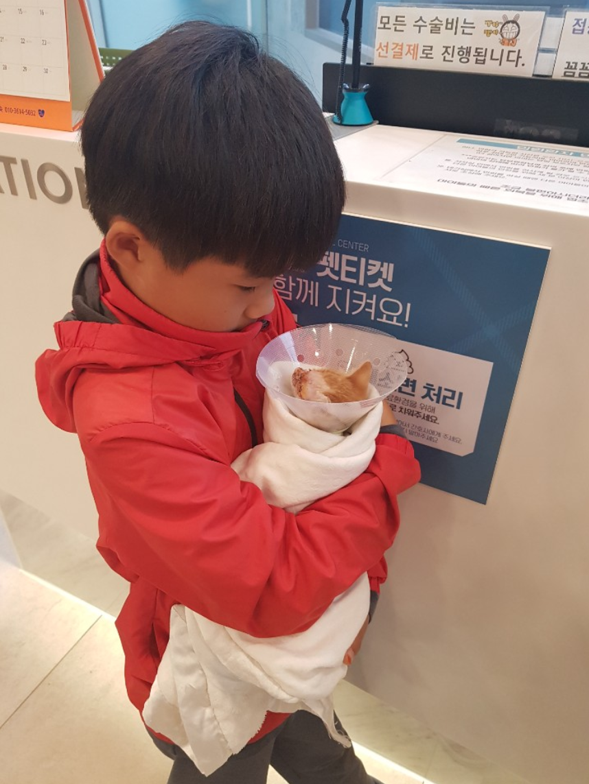 지나가던 어느 할아버지가 너 키우려면 키워라 하고 두고 갔다는데 얼마다 황당하던지. 고양이 상태가 이미 내일이면 안녕하고 지구 떠날 것 같았거든요. 눈엔 고름투성이에 못 먹어서 몸은 한주먹도 안되고 딱 영혼만 가지고 있는 무게 정도. 애들 앞에서 생명이 소중하다 어쩌고 저쩌고 했어도 지금 이 고양이를 놔두고 오면 생명, 사랑 소중하다.. 이런 거 말로만 하는 거짓부렁이 부모 되는 거 한 순간이 상황이었어요. 데려가는 순간 이 고양이 인생을 책임져야 하는데 어쩌나 싶은..